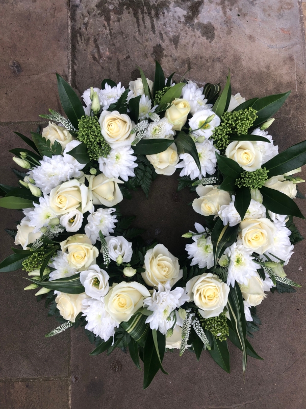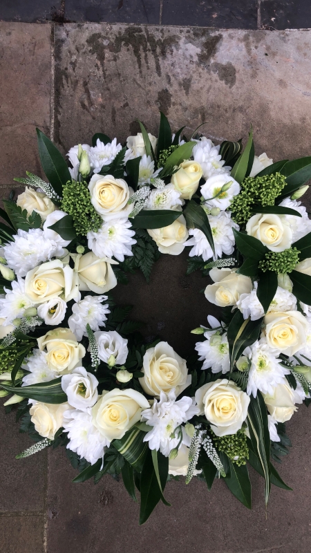 Open wreath of all white flowers including white roses.