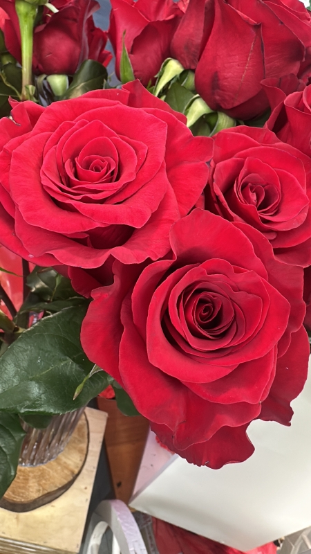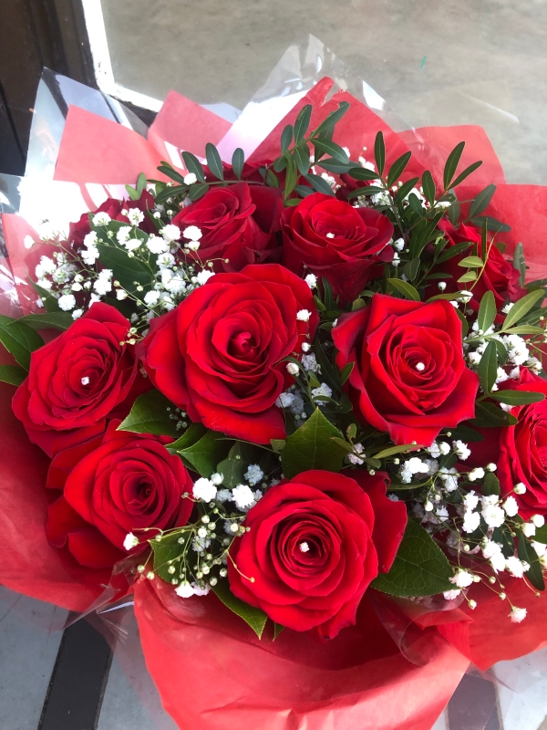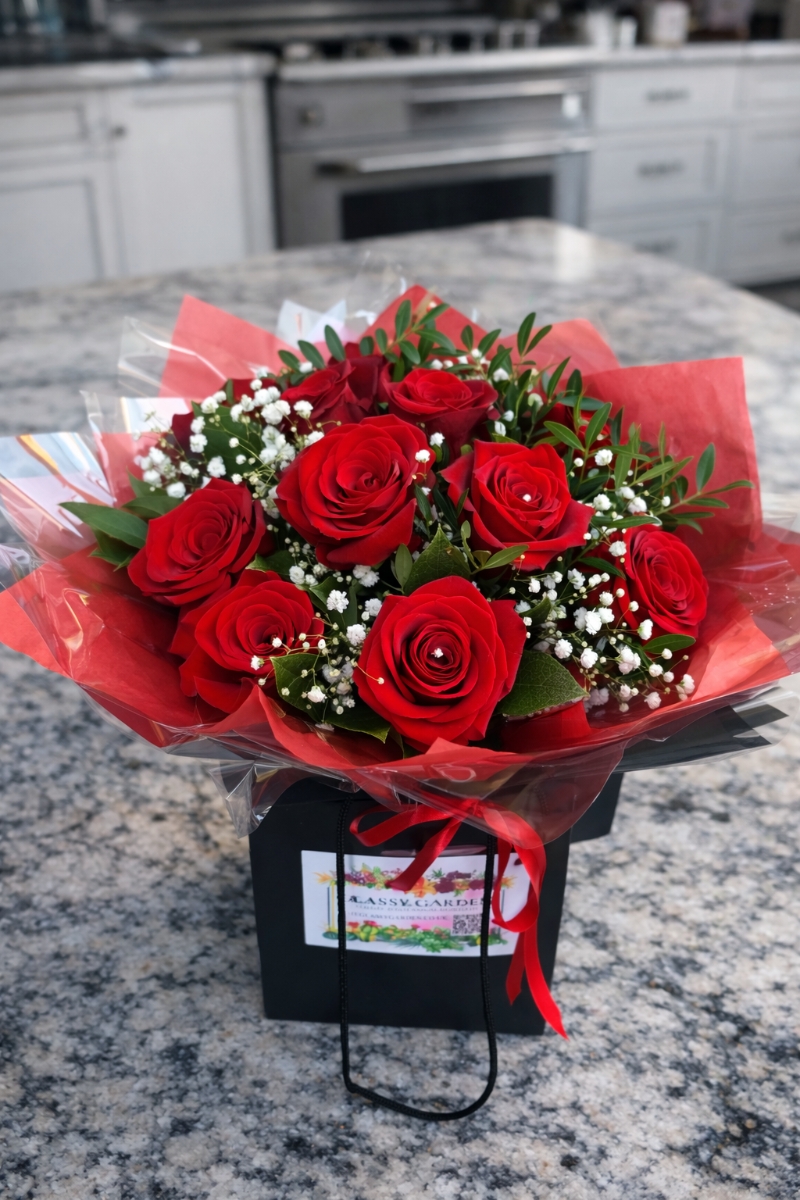 Glassy Gardens unique luxury velvet Red Roses & gyp complete with diamonds in a sassy black gift bag with stylish red wrapping makes this gift classic