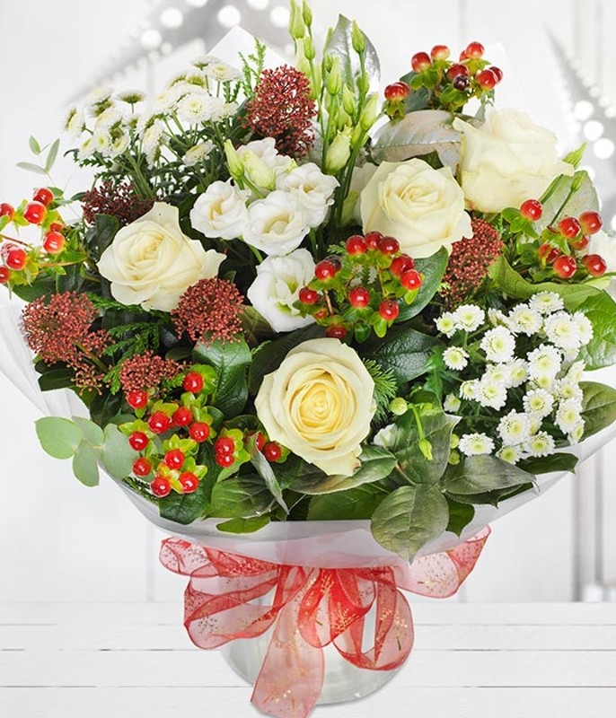 Bouquet of pure white blooms including Roses finished with warm hypericum berries