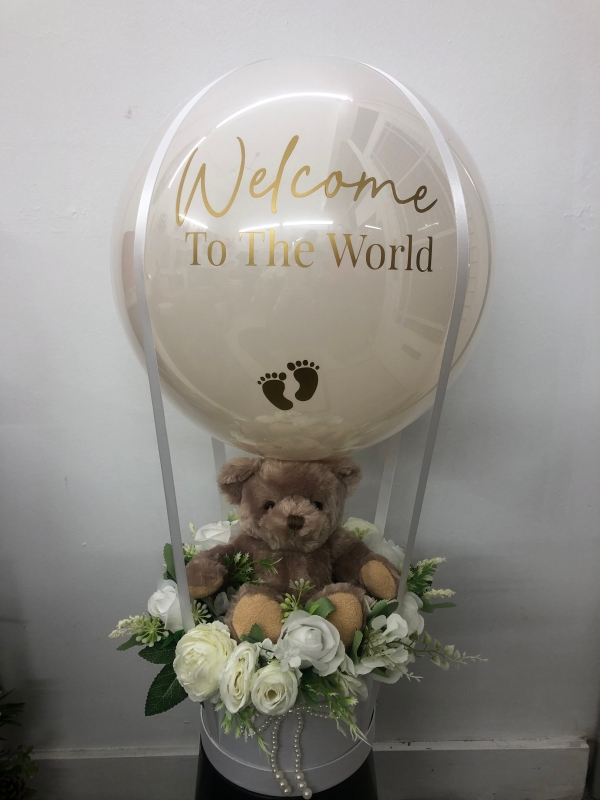 This cute balloon arrangement is perfect for the birth of a baby. we personalise the balloon with your own message please add this into special instructions. Example welcome to the world baby ............. plus DOB