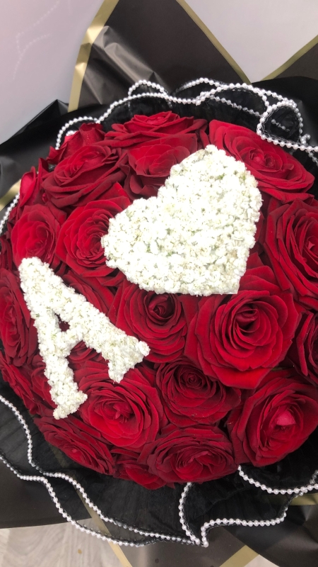 This unique rose bouquet consisting of 25 large red roses and fresh white gypsophila initial and heart is the absolute gift of true love. please add your chosen letter in special instructions