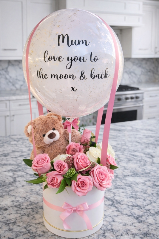 Perfect Mothers Day gift of fresh pink & white roses balloons and a cute teddy bear. We also do this in artificial roses which is the £50 option
